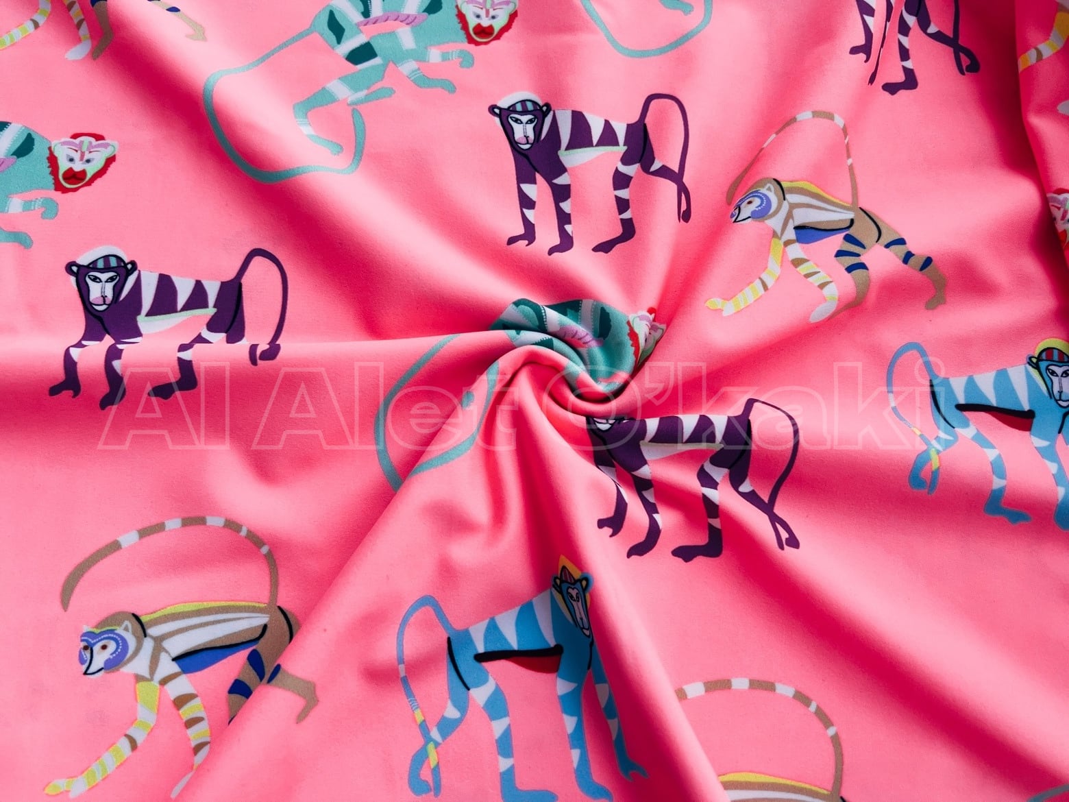 キュートでポップなネオンピンクのモンキー柄が特徴の水着生地は、夏のビーチやプールでの注目を集める一品です。柔らかな肌触りと快適なストレッチ性を活かし、アクティビティを楽しむ際もぴったり。濡らしてご使用いただけへば、気過熱効果によって熱中症対策にもお役立ていただけます。(必ず熱中症予防につながるわけではありませんので、愛犬の健康状態にはご注意ください。)