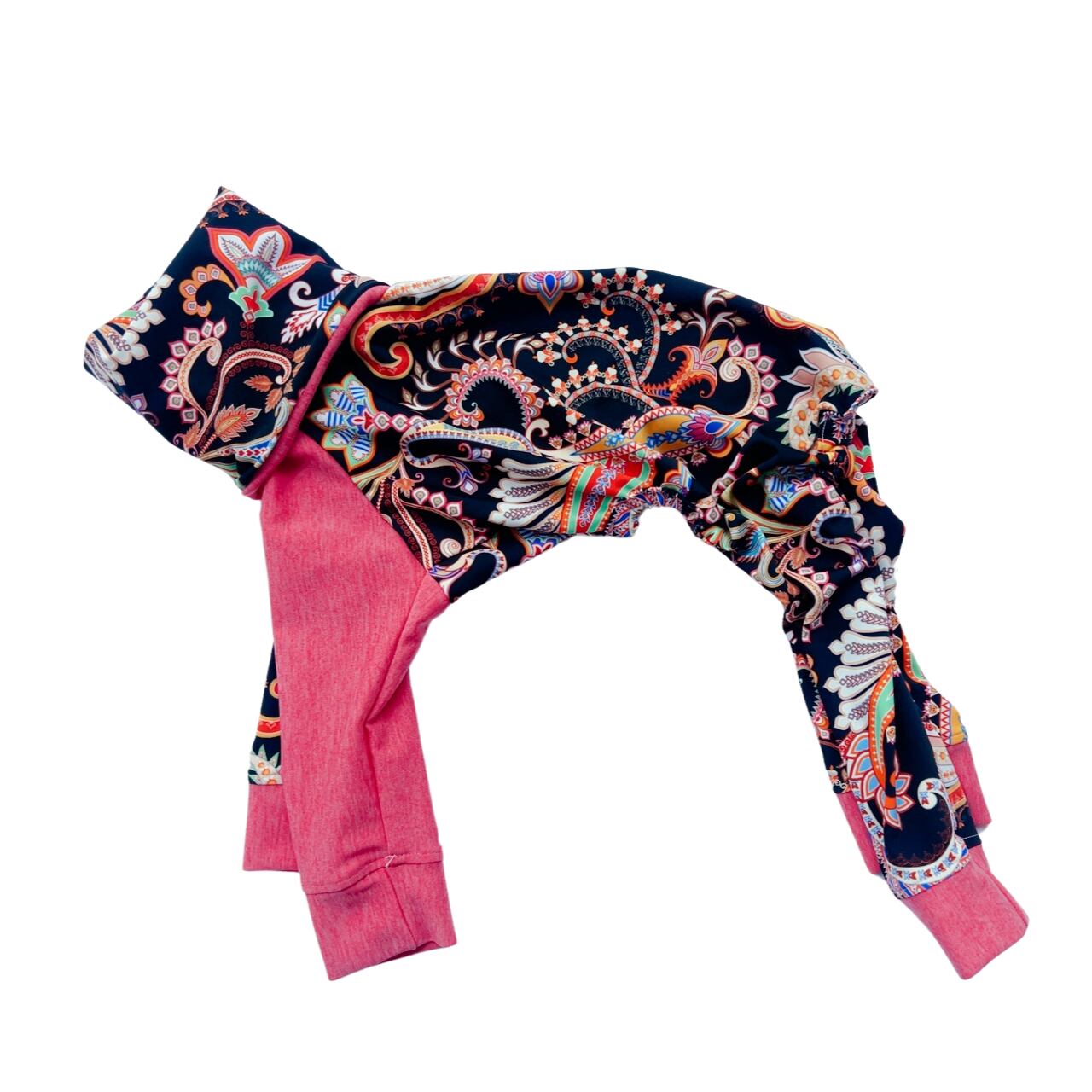 アメリカから直輸入したブラックペイズリーの美しい水着生地を使用したロンパースです。独特なデザインは、夏のビーチやプールで愛犬を引き立てます。なめらかな肌触りと優れたストレッチ性で、アクティブな犬にも快適にお使いいただけます。